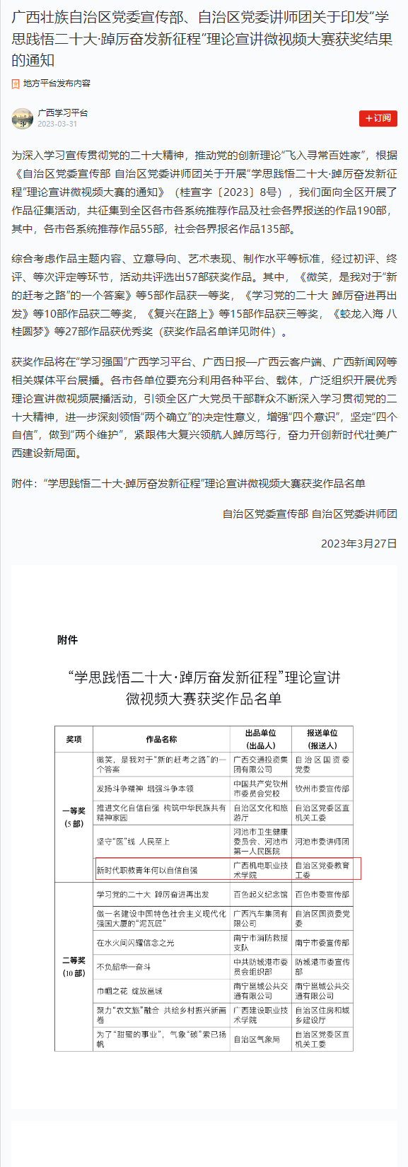 近日,由自治区党委宣传部、自治区党委讲师团举办的“学思践悟二十大·踔厉奋发新征程”理论宣讲微视频大赛获奖结果公布。由自治区党委教育工委报送,taptap官网拍摄的理论宣讲微视频《新时代职教青年何以自信自强》荣获一等奖。
