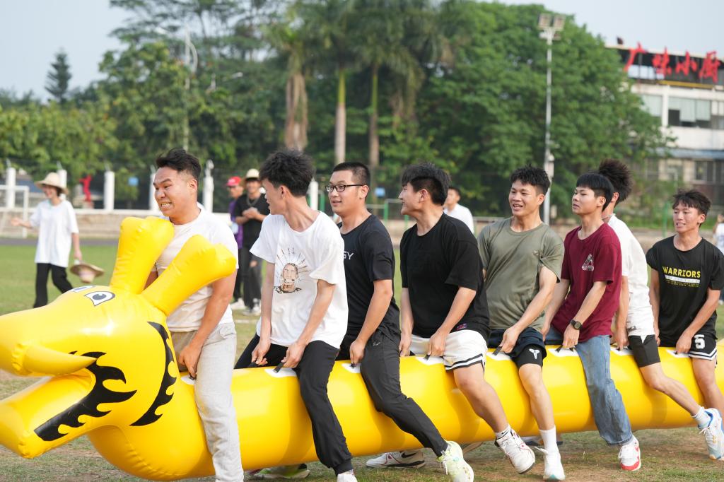大象拔河作为一项体力和团队合作的运动,需要选手们发挥出自己的力量和团结精神。在比赛中,双方运动员在比赛场地上,将一条长绸布带做成的圆环分别套于胸部(带子从腰间通过),四肢着地并背向对方,向自己的前进方向奋力爬进,以一方将置于两者之间的坠条拉过自己一侧的决胜线为胜利。来自建筑工程学院的选手们紧密团结,齐心协力,获得了第一名。这场比赛展现了团结的力量,也彰显出了参赛选手的坚韧不拔和顽强精神。