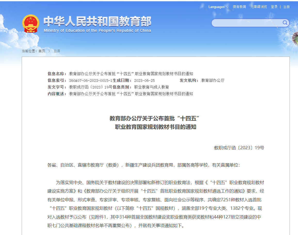 此次,经有关单位申报、形式审查、专家评审、专项审核、专家复核、面向社会公示等程序,共确定7251种教材入选首批“十四五”职业教育国家规划教材,涵盖全部19个专业大类、1382个专业。