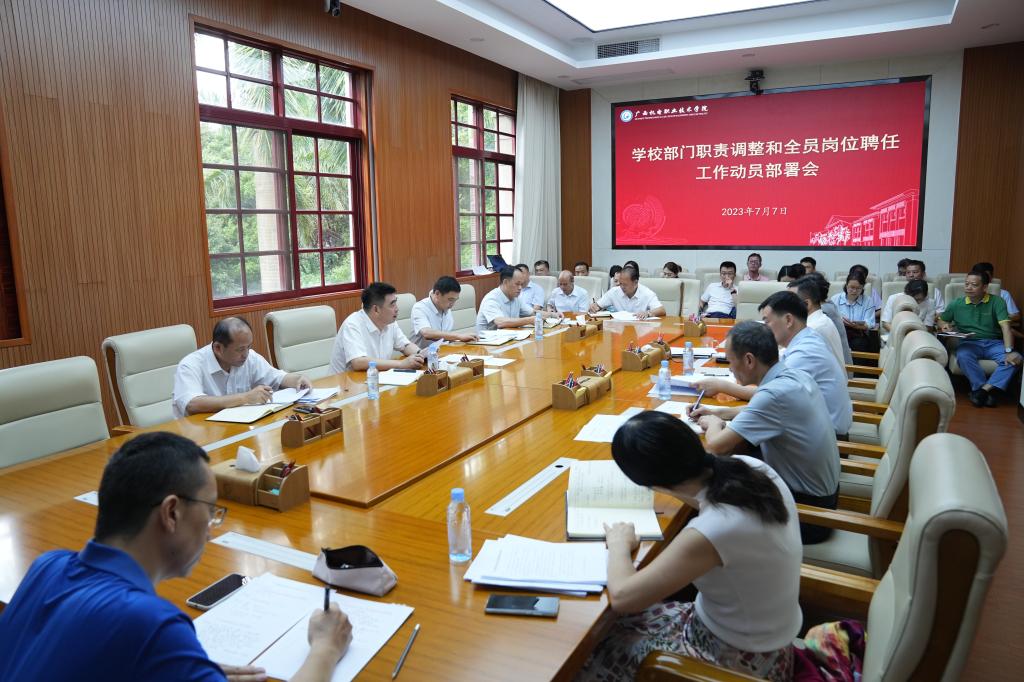 7月7日,学校在第一会议室召开部门职责调整和全员岗位聘任工作动员部署会。校党委书记黄小敬出席会议并讲话,学校领导陈科鹤、黄政艳出席会议,各教学单位、职能部门主要负责人参加会议。会议由吴世先校长主持。
