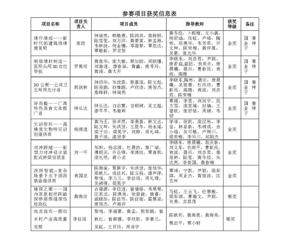 学校参加该项赛事以来,累计获国赛铜奖8项、获广西区赛金奖27项,学校连续五年获得优秀组织奖,涌现了一大批技术含量高、市场潜力大、社会效益好的高质量项目。学校将继续深化创新创业教育改革,构建三阶递进“双创”特色课程建设,将创新创业教育融入人才培养全过程,培养学生敢闯的素质,会创的能力。