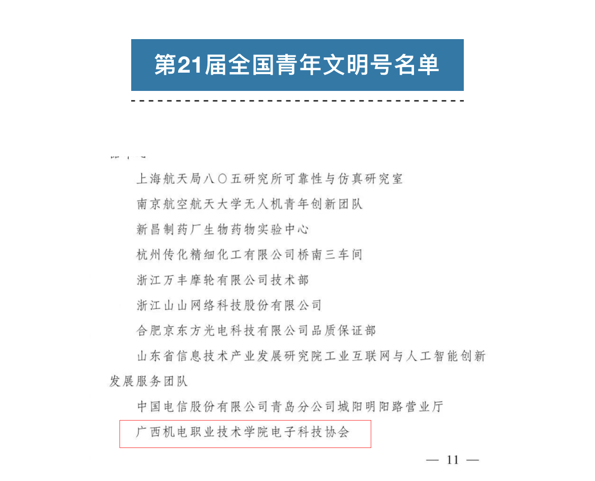 电子科技协会荣获“一星级全国青年文明号”称号,充分体现了taptap官网社团工作的亮点和“三全育人”成效,对于进一步增强校园文明建设和推进学校高质量发展具有重要意义。学校将以此为契机,坚持党建引领,汇聚青年力量、勇挑时代重担、奋发进取争先,为党育人、为国育才,团结带领全校师生为把学校建设成为广西领先、全国一流、国际知名的智能制造特色校贡献青春和力量。