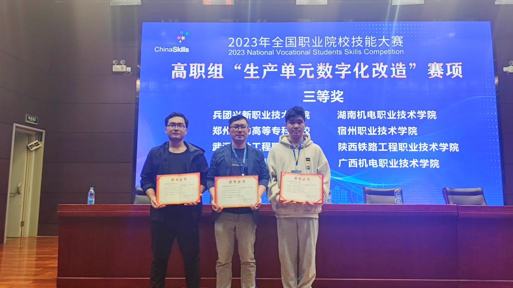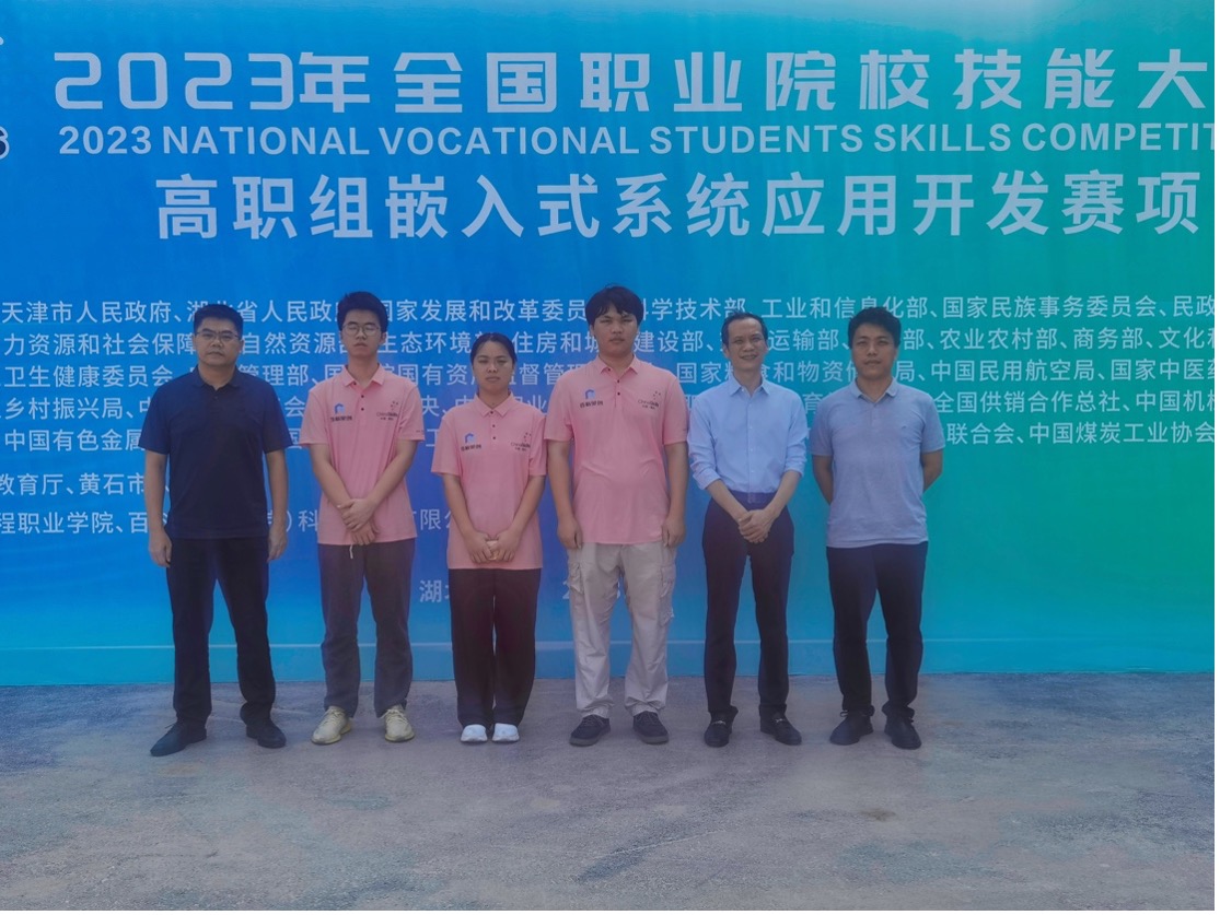 “智能电子产品设计与开发”、“生产单元数字化改造”是今年赛项改革后首次出现的师生同赛赛项,马子龙老师和电子2001班方志生、邓立成、电子2101班刘星煜3名同学参加了“智能电子产品设计与开发”赛项,获得全国二等奖。熊治文老师和赵大伟、李林宏同学参加了“生产单元数字化改造”赛项,获得全国三等奖。由钟国文、罗捷老师指导的电子2001班李乃庆、电子2101班张海彬、电子2201班徐军宁组成的参赛队参加了“嵌入式系统应用开发”赛项,获得全国三等奖。