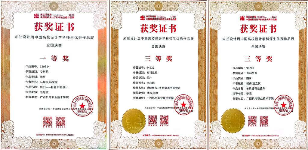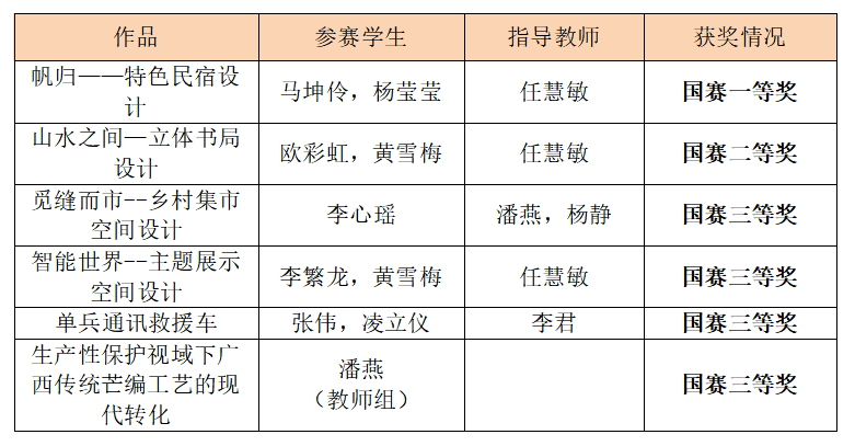 艺术设计学院“以赛促学、以赛促练、以赛促改、以赛促管”的教育改革实践已经实现日常化,拓展学生横向思维能力,鼓励学生跨专业、跨学科合作,形成良好氛围。学生获奖作品包含智能装备、乡村环境建设、文化创意产品等,体现了学生关注国家智能制造领域发展、热爱广西本土文化,通过高质量的作品展示学生的青年担当和专业素养,体现了“三全育人”的成效。未来,艺术设计学院将继续结合学校学科专业优势,充分调动学生参与设计实践的积极性和主动性,培养适应社会经济发展、服务地方产业的高素质应用型人才,为实现将学校建成“广西领先、国内一流、国际知名的高水平智能制造特色校”的奋斗目标作出更大贡献。