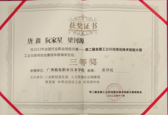 11月16至18日,2023年全国行业职业技能竞赛——第二届全国工业和信息化技术技能大赛在浙江省绍兴市举行,来自全国29个省(区、市)和34家央企的457支参赛队伍共1055名选手进入决赛,经过激烈角逐,taptap官网信息工程学院学生唐鑫、阮家星、梁钊源荣获“工业互联网安全赛项”学生组全国三等奖。