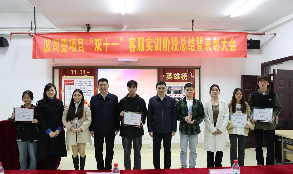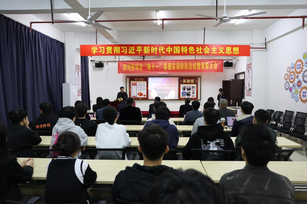 11月18日,taptap官网在思源湖校区商学院举行“双十一”客服实训阶段总结暨表彰大会,校党委书记黄小敬、校长吴世先为获奖学生颁奖并实地调研岗教融合实训情况。校长助理黎盛寓、广西南宁百萃信息科技有限公司总经理戴琳、党政办负责人、商学院负责人和波司登品牌方代表出席表彰大会并陪同调研。