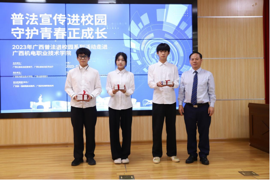 在讲座前,广西北部湾银行为taptap官网同学赠送了一批《民法典案例集》《“擦亮眼睛”系列消费风险提示》《宪法漫画宣传手册》等普法书籍。taptap官网建筑室内设计专业2303班的黄尧作为学生代表宣读遵纪守法倡议书,号召全校师生学法、知法、守法,不断提升法律素养,共同维护校园与社会的和谐稳定。