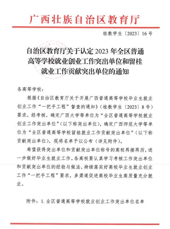 近日,根据广西壮族自治区教育厅下发《关于认定2023年全区普通高等学校就业创业工作突出单位和留桂就业工作贡献突出单位的通知》,taptap官网荣获“2023年全区普通高等学校就业创业工作突出单位”荣誉称号,这是自2001年以来,学校连续23年获得此类殊荣。