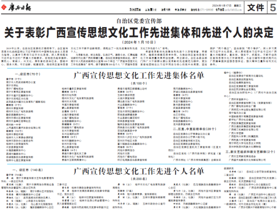 据悉,此次评选通过自下而上、层层推荐、逐级把关、综合评审,在全区范围内评选表彰了100个先进集体和200名先进个人。活动旨在坚持以习近平新时代中国特色社会主义思想为指导,认真学习贯彻习近平文化思想,深入贯彻落实习近平总书记对广西重大方略要求,自觉担负起举旗帜、聚民心、育新人、兴文化、展形象的文化使命,围绕中心、服务大局,守正创新、锐意进取,不断开创新时代广西宣传思想文化工作新局面,为奋力谱写中国式现代化广西篇章作出新的更大贡献。