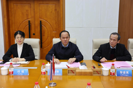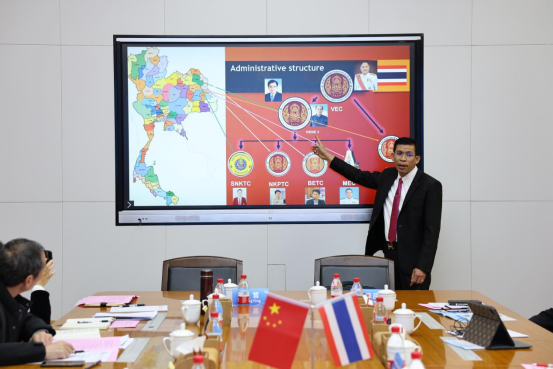 泰国东北二区职业教育研究院院长萨提详细介绍了研究院的组织架构与运行情况。昆孟工业与社区教育学院院长蒙满则提出了具体的合作项目计划,包括师生互访交流、短期学习、在线语言培训以及邀请中方教师赴泰教授中文等。黄政艳对相关项目计划表示高度认可,认为这些项目具有很强的可行性和广阔的前景。