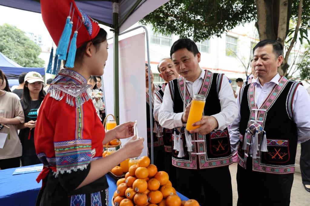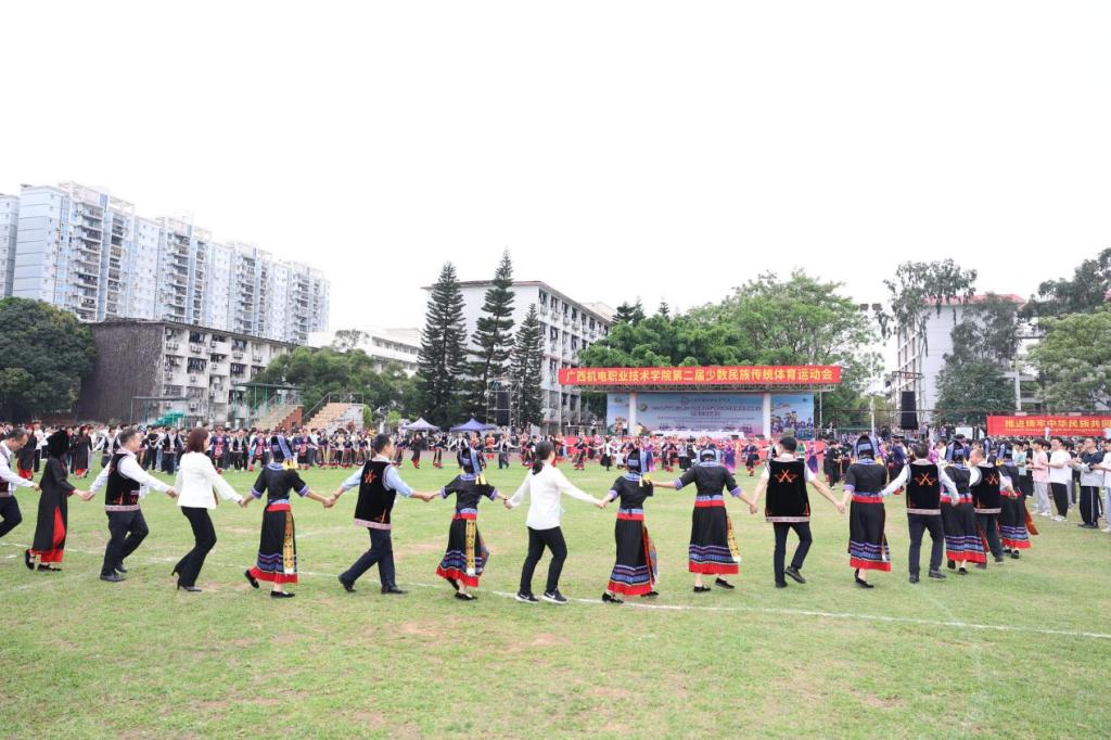 吴世先宣布“广西三月三·八桂嘉年华”铸牢中华民族共同体意识主题活动正式开幕,师生们共同参与到民族团结舞的互动环节中,大家手牵手,随着音乐的节奏欢快起舞,寓意着各民族像石榴籽一样紧紧抱在一起,共同团结奋斗、共同繁荣发展,谱写民族团结进步的新篇章。