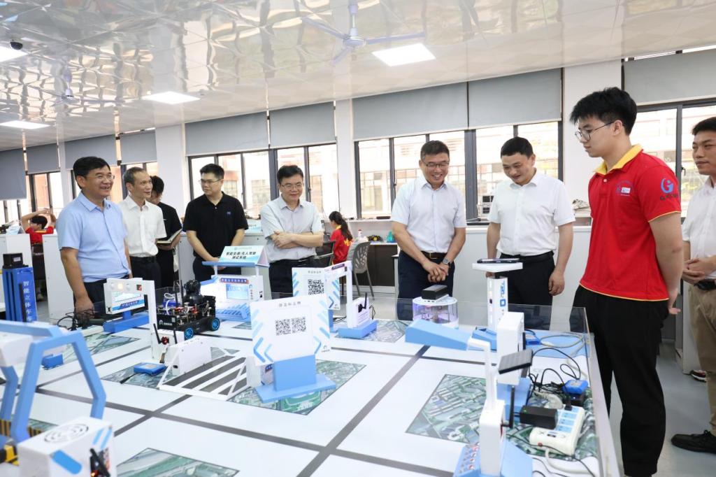 在电子信息工程学院创新工场,听取了学校通过项目教学、案例教学、探究式教学等方式培养高素质技术技能人才的生动实践,观看了学生制作的智能家具及智能交通无人驾驶测试系统。