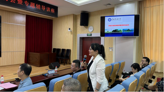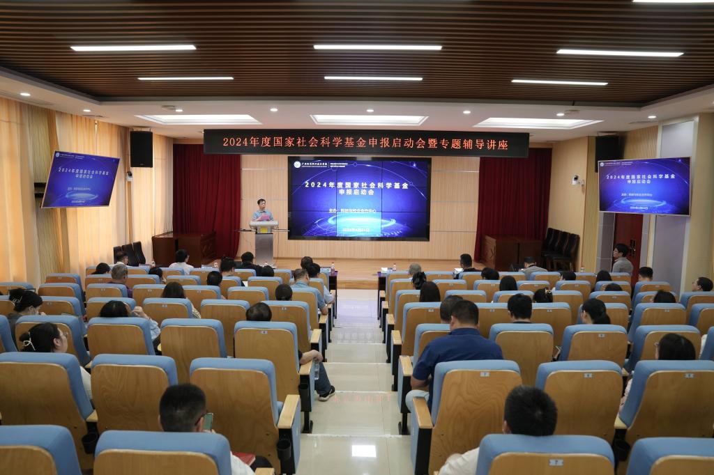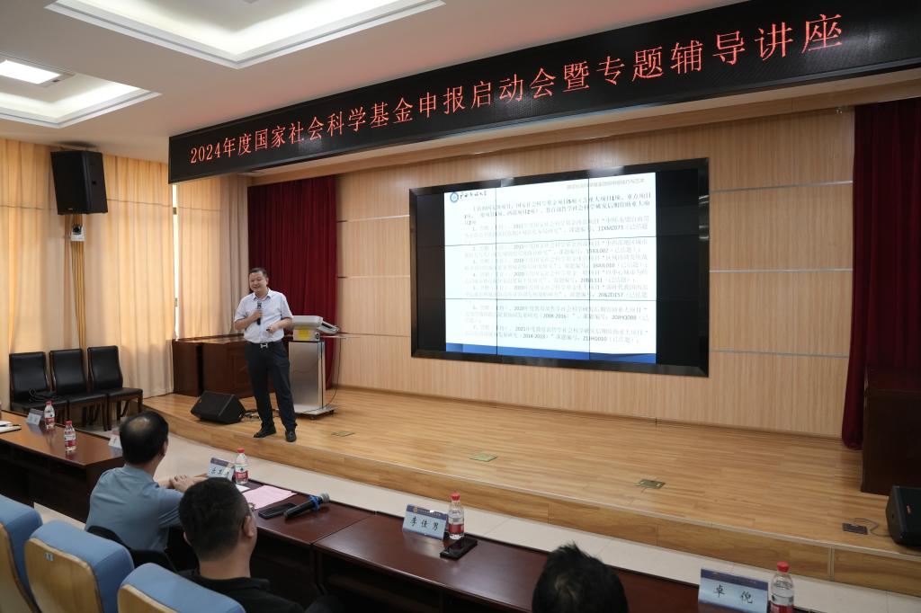 讲座邀请了广西民族大学研究生院院长、国家社会科学基金重大项目首席专家曾鹏教授为教师作辅导,他主要围绕国家社科基金项目申报的技巧与实操,结合自身丰富的学术研究和项目申报经验,对国家社会科学基金项目的选题、文献综述、研究内容、研究方法选择、研究路线设计等方面进行了详细讲解。
