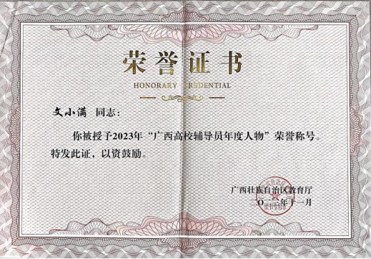 由广西壮族自治区教育厅开展的2023年“广西最美高校辅导员”暨“广西高校辅导员年度人物”评选活动结果揭晓,taptap官网文小满老师荣获2023年“广西高校辅导员年度人物”荣誉称号。