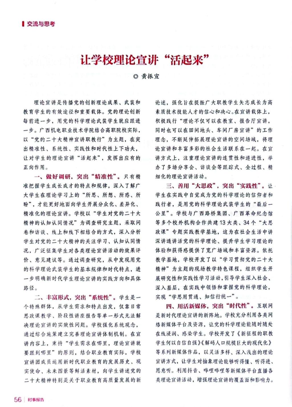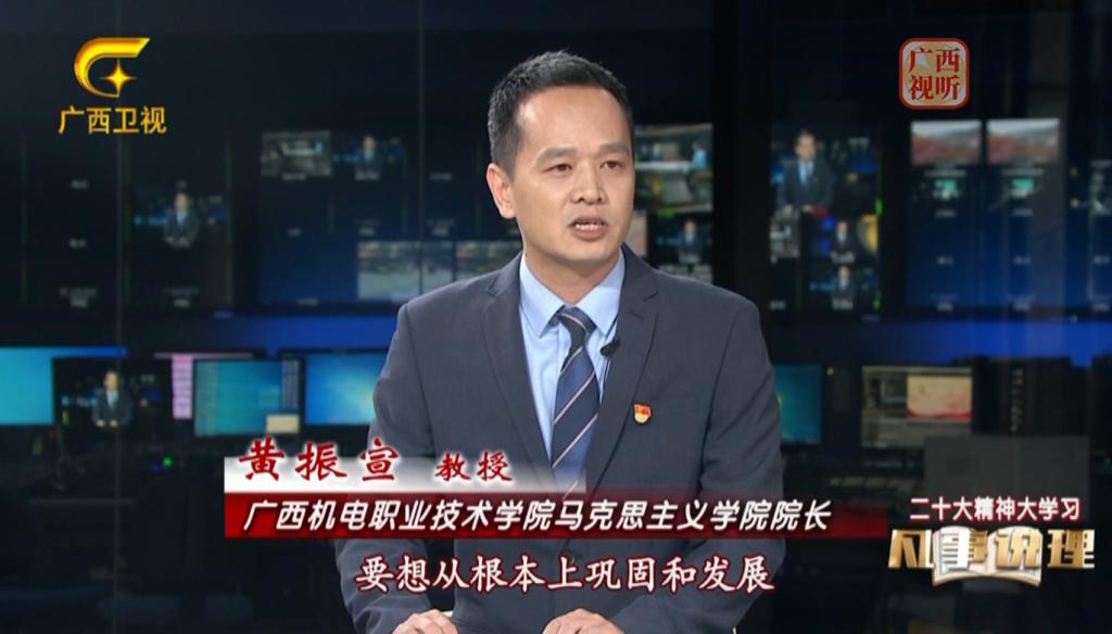 2023年,黄振宣坚持在理论宣讲的“接地气”“显活力”“广覆盖”“强队伍”上下功夫,走进党政机关、企业、学校、乡村、电视台开展理论宣讲20多场,在《中国文化报》《学习强国》《广西日报》《时事报告》等权威媒体上发表多篇党的创新理论阐释文章。任广西高校学习宣传贯彻党的二十大精神巡讲团第十组负责人,带领团队赴多所院校开展“党的二十大精神职教行”宣讲活动,组织团队录制了20多堂“行走的思政课”示范课堂,荣获全区高校思政课教师讲党的二十大精神优秀微课评选活动一等奖等多项荣誉。积极推动学校与广西日报社合作,成功举办面向社会的“党的创新理论通俗化大众化优秀理论文章征集活动”。作为特邀嘉宾参加广西卫视《凡事说理》“党的二十大精神大学习”系列访谈活动。在自治区党委宣传部、自治区党委讲师团举办的2023年“学思践悟二十大·踔厉奋发新征程”理论宣讲大赛中获一等奖,宣讲作品获学习强国平台展播。
