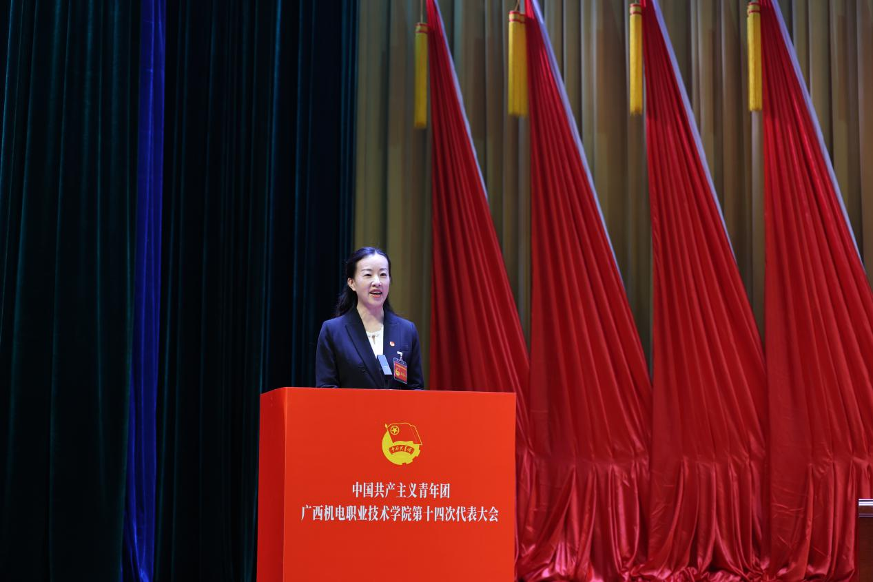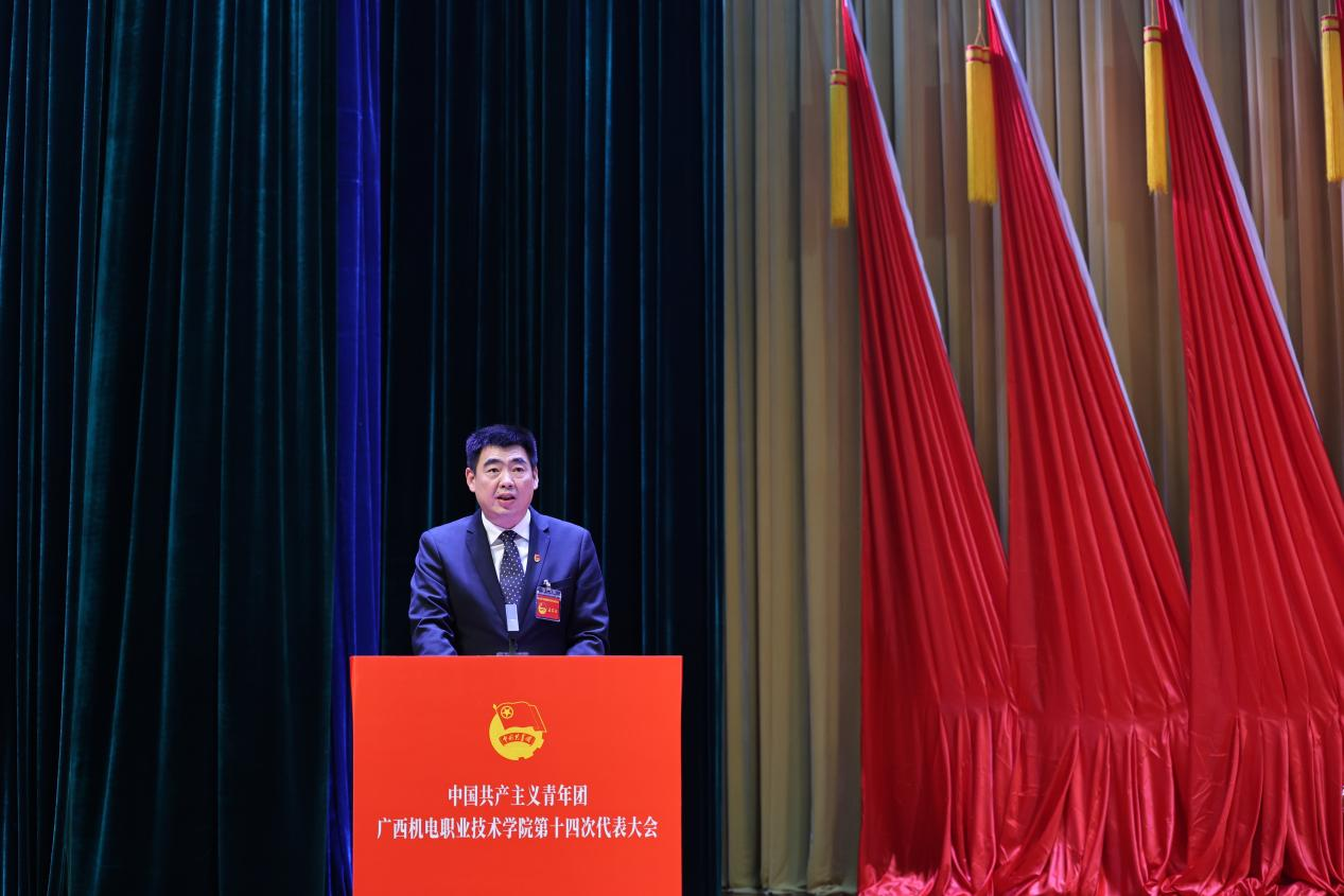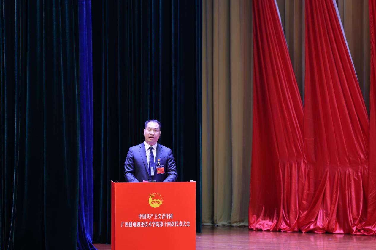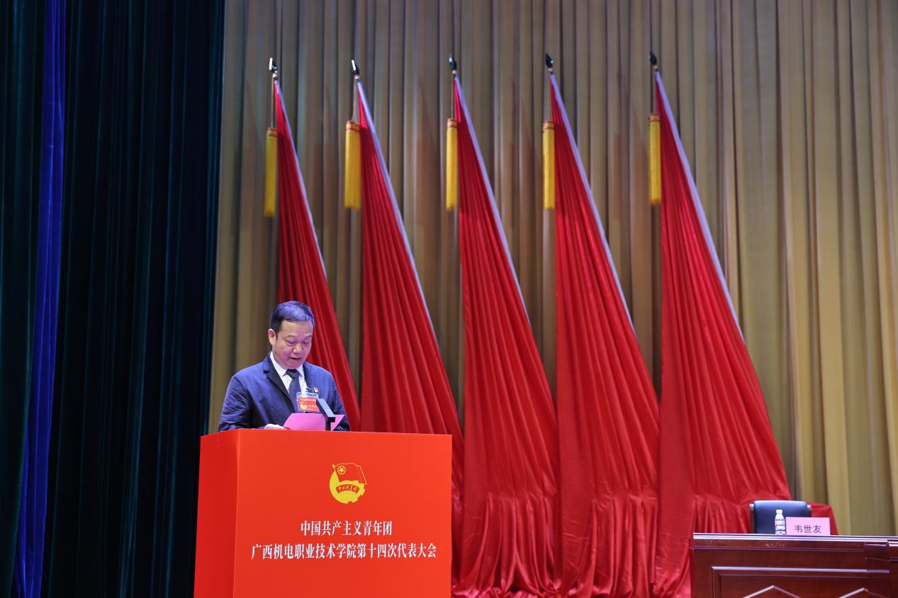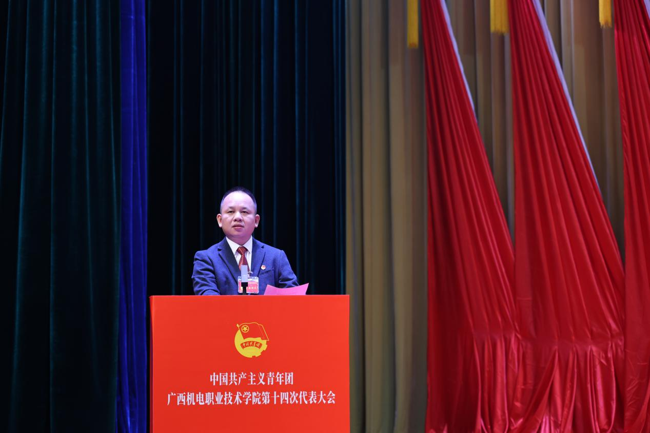 学校团委书记韦世友代表共青团taptap点点官网第十三届委员会向大会作了题为《高举团旗跟党走 勇担使命建新功团结带领机电青年在争创广西领先、国内一流、国际知名高水平智能制造特色校中绽放青春光彩》的工作报告。