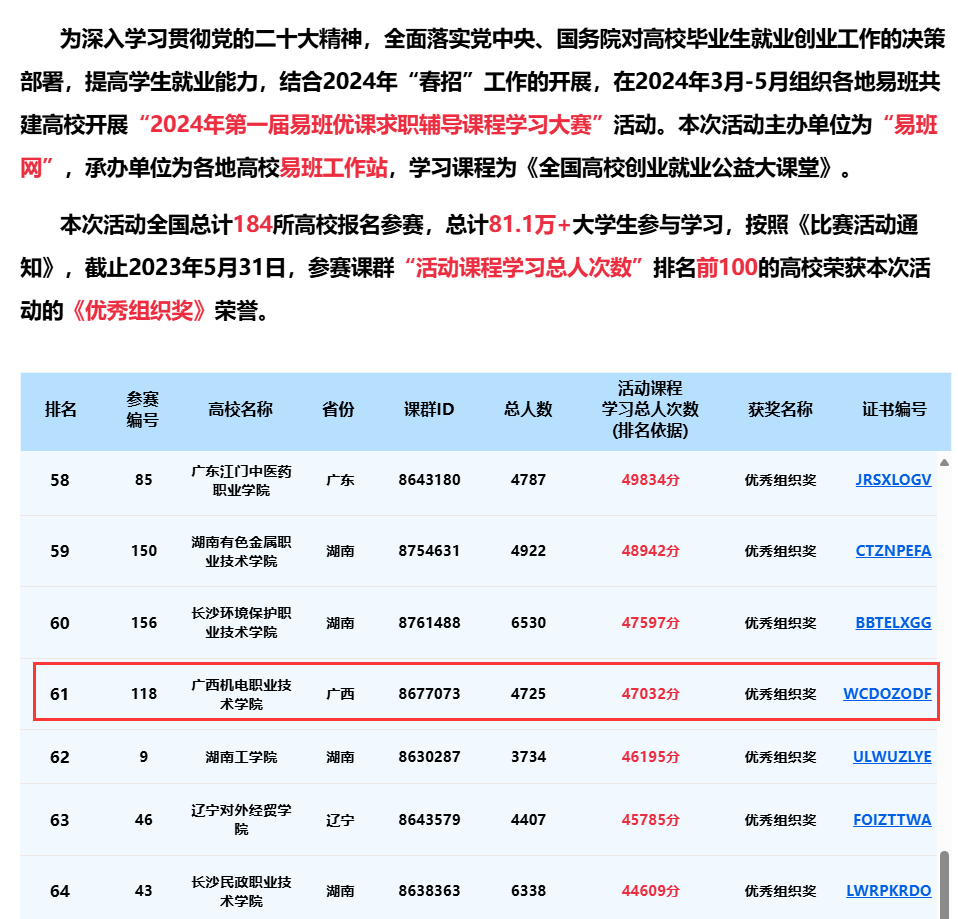 本次大赛旨在深入学习贯彻党的二十大精神,全面落实党中央、国务院对高校毕业生就业创业工作的决策部署,通过易班平台为广大学生提供优质的求职辅导课程,帮助他们提升就业能力,更好地适应市场需求。共有81.1万大学生参加,总计184所易班共建高校通过“易班优课”平台参与评选。taptap官网易班制作的 “2024年第一届易班优课求职辅导课程学习大赛”优课课群参与人数达到4725人,课群活跃指数达到6111,学习总人次为47032,学校最终荣获“优秀组织奖”。