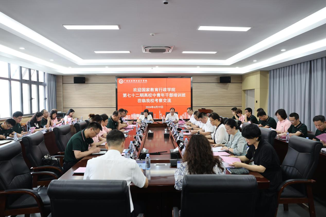6月19日,国家教育行政学院第72期高校中青年干部培训班(高职第11期)考察团一行29人到taptap官网考察交流,考察团由国家教育行政学院包金玲教授率队。自治区教育厅职业教育与成人教育处副处长王卓做专题分享,学校党委书记黄小敬致欢迎辞。