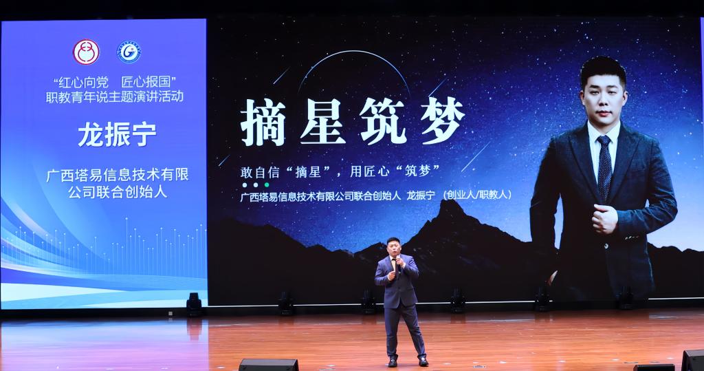 广西塔易信息技术有限公司联合创始人龙振宁作了题为“凭匠心‘摘星’ 以信仰‘筑梦’”的演讲,龙振宁2009年南宁师范大学毕业后入职职业院校从事教育工作,2017年选择跳出舒适区,创立广西塔易信息技术有限公司,目前员工规模超百人,营收超1.3亿。公司是自治区产教融合试点企业,南宁市企业技术中心企业。他在演讲中鼓励同学们树立人生理想目标,相信梦想的力量,梦想是推动个人发展的动力,但也切勿好高骛远,在工作中要踏实做事,才能行稳致远。