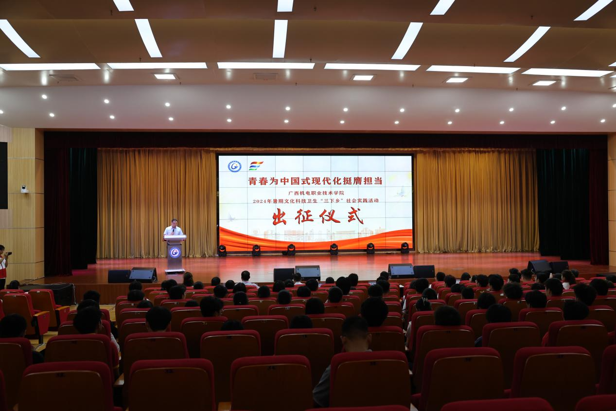 7月12日上午,学校2024年大学生暑期文化科技卫生“三下乡”社会实践活动出征仪式在博远楼小礼堂举行。学校副校长黄振宣出席仪式并讲话。校团委书记韦世友主持仪式。