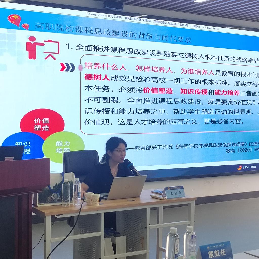 重庆电子工程职业大学电子与物联网学院王宝英副教授作题为《职业院校课程思政示范课的设计与实施》的专题分享,从团队建设、课程思政、数字化教材建设进行了精细化讲解。