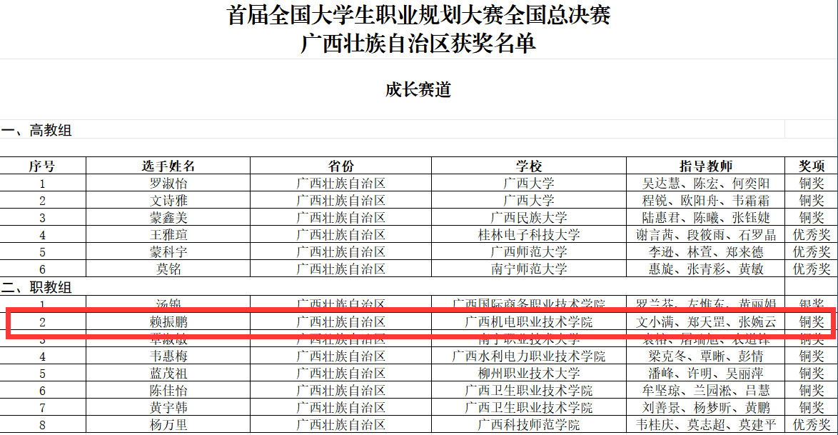 筑梦青春志在四方,规划启航职引未来。近日,首届全国大学生职业规划大赛全国总决赛获奖名单公布。taptap官网文小满、郑天罡、张婉云老师指导的智能焊接技术专业赖振鹏同学在职教组的成长赛道中获得铜奖。其中,广西在该赛道获得银奖1枚、铜奖6枚、优秀奖1枚。