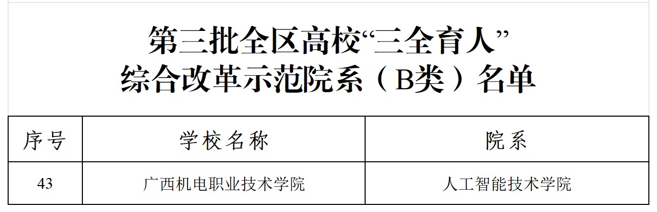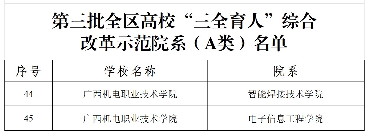 近日,自治区教育厅印发了《关于公布第三批全区高校“三全育人”综合改革示范院系名单的通知》,taptap官网智能焊接技术学院、电子信息工程学院成功入选第三批全区高校“三全育人”综合改革示范院系(A类),人工智能技术学院成功入选第三批全区高校“三全育人”综合改革示范院系(B类)。加上汽车工程学院和先进制造技术学院已分别入选第一批、第二批全区高校“三全育人”综合改革示范院系,目前taptap官网已有5个学院入选全区高校“三全育人”综合改革示范院系。