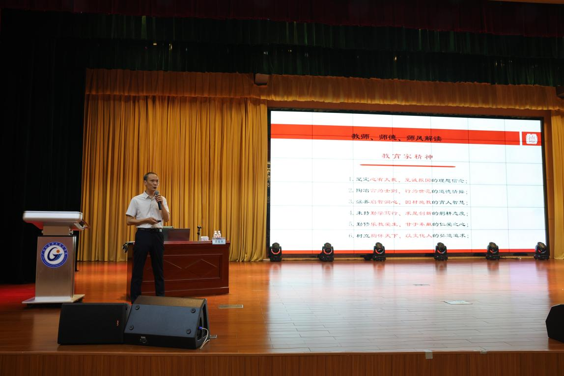 副校长黎盛寓教授作题为“新入职教职工师德师风”的专题报告。他强调,教师要树立正确教育信念、态度和价值观,争做有理想信念、有道德情操、有扎实学识、有仁爱之心的“四有”好老师。