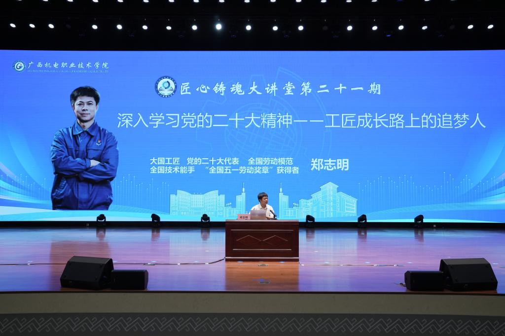 “大国工匠”郑志明的报告以《深入学习党的二十大精神——工匠成长路上的追梦人》为题,用生动质朴的语言和真挚的情感分享自己参加中国共产党第二十次全国代表大会的感受,讲述了自己投身汽车工业制造的初心理想,以及从一名钳工逐步成长为国家级技能大师工作室带头人、全国技术能手、享受国务院特殊津贴专家,以及当选党的二十大代表的成长经历与心路历程。他勉励在座的同学们要坚定不移地跟随党的步伐,踏实做事、精益求精,在学技能、精技能、强技能的舞台上尽情施展青春年华。