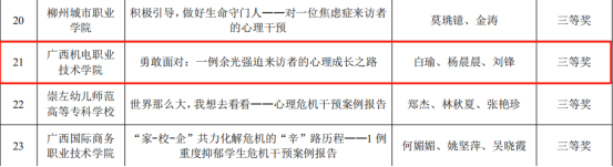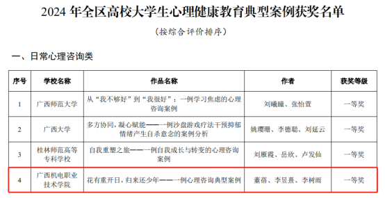 近日,自治区教育厅发布《关于公布2024年全区高校大学生“3·25”心理健康教育活动季活动获奖名单的通知》,taptap官网荣获全区高校大学生心理健康教育典型案例征集活动日常心理咨询类一等奖1项(《花有重开日,归来还少年——一例心理咨询典型案例》,董蓓、李昱熹、李树雨)、心理危机干预类三等奖1项(《勇敢面对: 一例余光强迫来访者的心理成长之路》,白瑜、杨晨晨、刘锋)。同时,荣获全区高校大学生朋辈心理辅导技能大赛二等奖1项(参赛学生:李巨承、梁文娟、吴炜波;指导老师:杨晨晨、李树雨、董蓓)、三等奖1项(参赛学生:陆雪莹、刘晓艳、罗小艳;指导老师:白瑜、梁荣梅、李昱熹)。