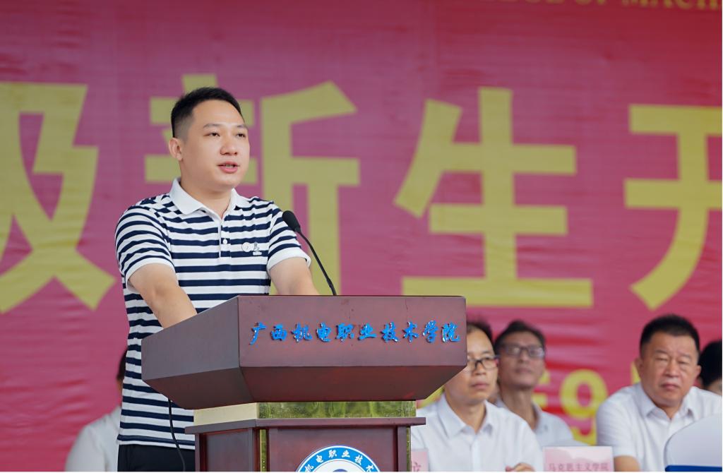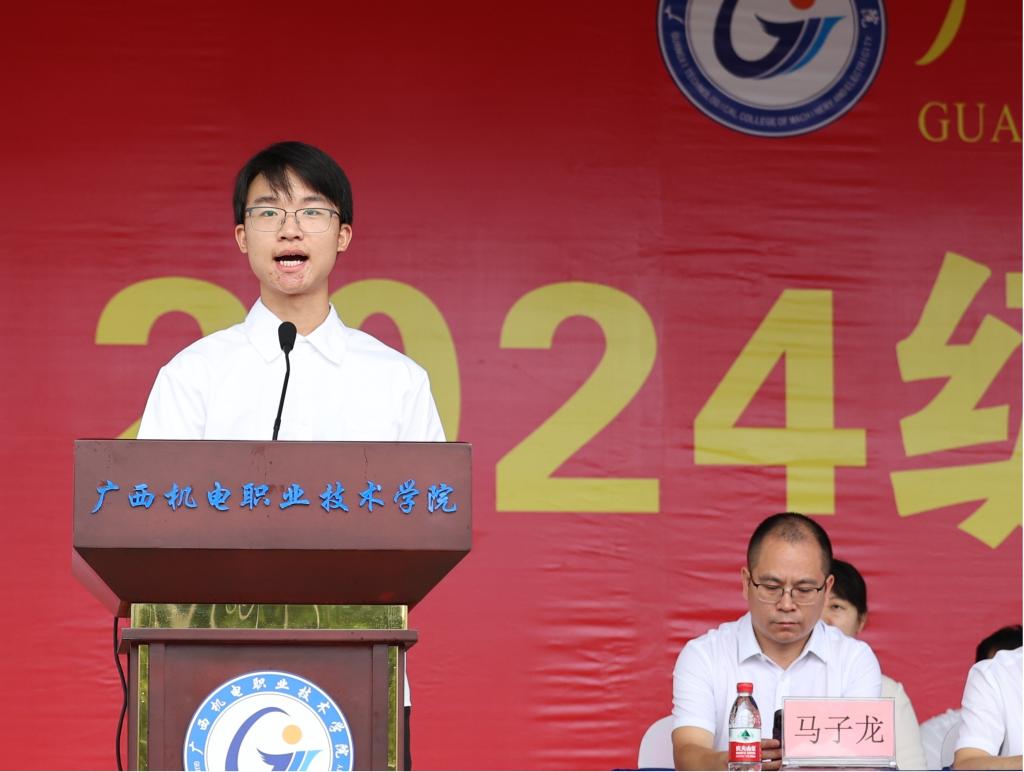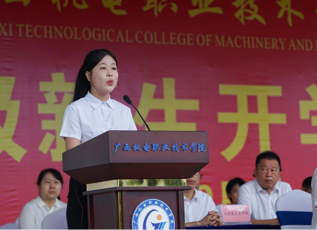 2024年广西职业院校技能大赛汽车营销赛项团体赛一等奖、2024中国国际大学生创新大赛“数广集团杯”广西赛区选拔赛银奖、铜奖、校园之声广播站副站长、汽车工程学院新能源2303班李梦萌同学作为老生代表致欢迎词,她分享了自己一年来的学习收获,号召新生们携手并进,以梦为马,不负韶华,在求知的道路上勇往直前,以实际行动共同书写青春篇章!