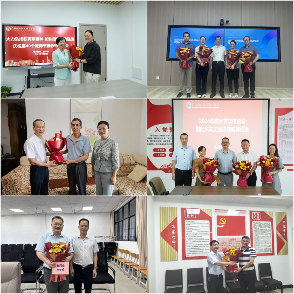致敬最美躬耕人,关心关怀暖师心。教师节前夕,校领导黄小敬、吴世先、程云燕、乐其顺、黎盛寓、刘捷、黄振宣,校长助理秦培林分别深入各单位、部门以及教职工家庭,慰问离退休和一线教师代表,送上节日的问候和诚挚的祝福。关心了解离退休老教师们的工作生活状况,感谢大家为学校事业蓬勃发展作出的突出贡献。倾听一线年轻教师心声,勉励大家争当“大先生”,做“四有”好老师,牢记为党育人、为国育才初心使命,落实立德树人根本任务,用过硬的专业能力、渊博的知识水平、深沉的仁爱之心,培育更多的德技双馨的技术技能人才。