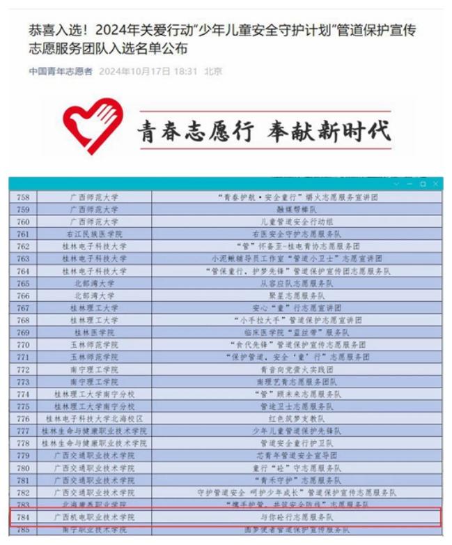 据悉,团中央青年志愿者行动指导中心联合有关单位组织开展的2024年关爱行动“少年儿童安全守护计划”管道保护宣传志愿服务团队遴选工作,面向全国高校遴选1000支大学生志愿宣讲团队,广西共有28支志愿服务团队入选。