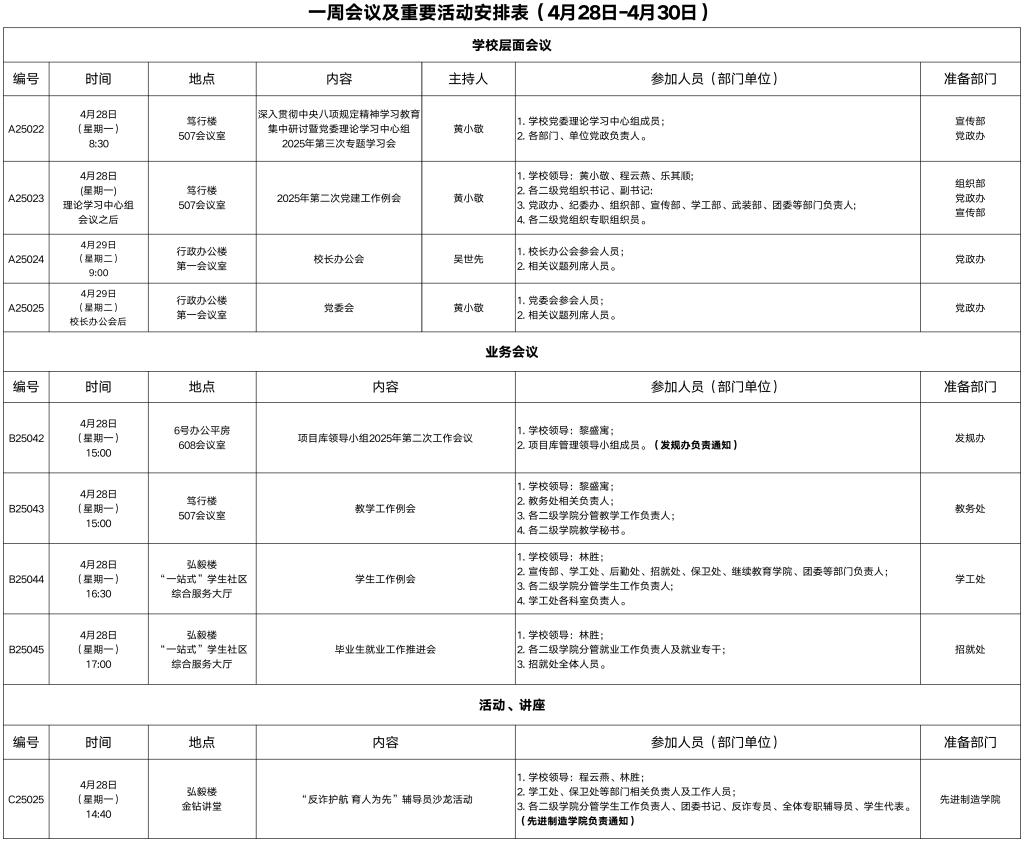 一周会议及重要活动安排表(4月28日-4月30日)