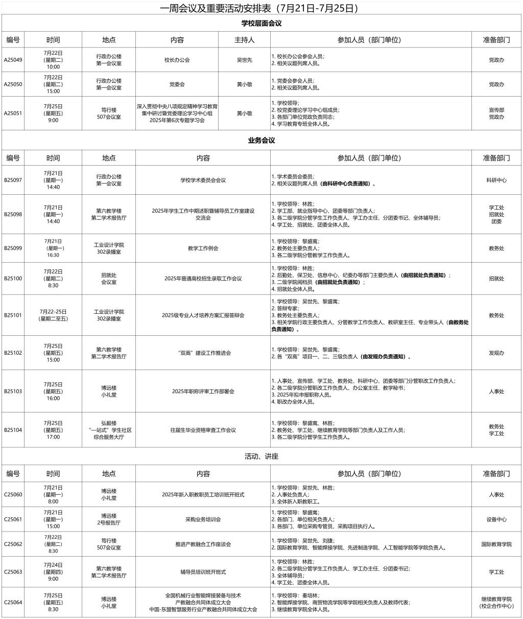 一周会议及重要活动安排表(7月21日-7月25日)