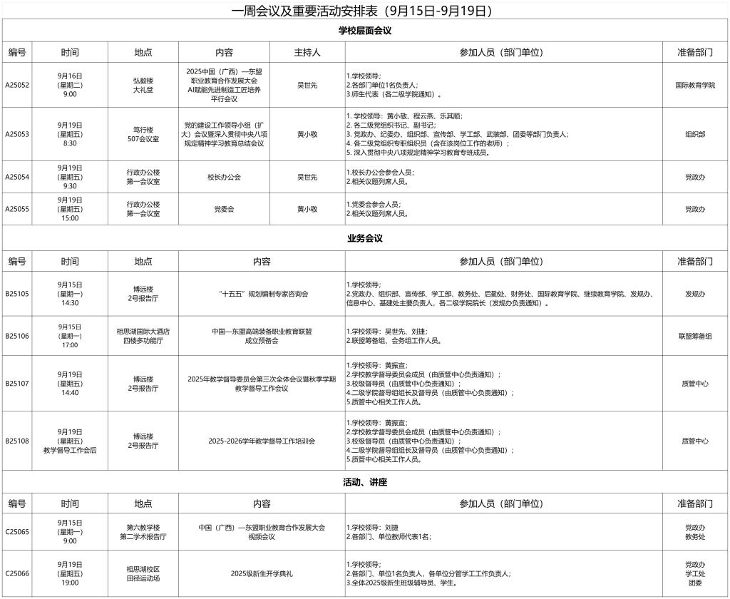 一周会议及重要活动安排表(9月15日-9月19日)