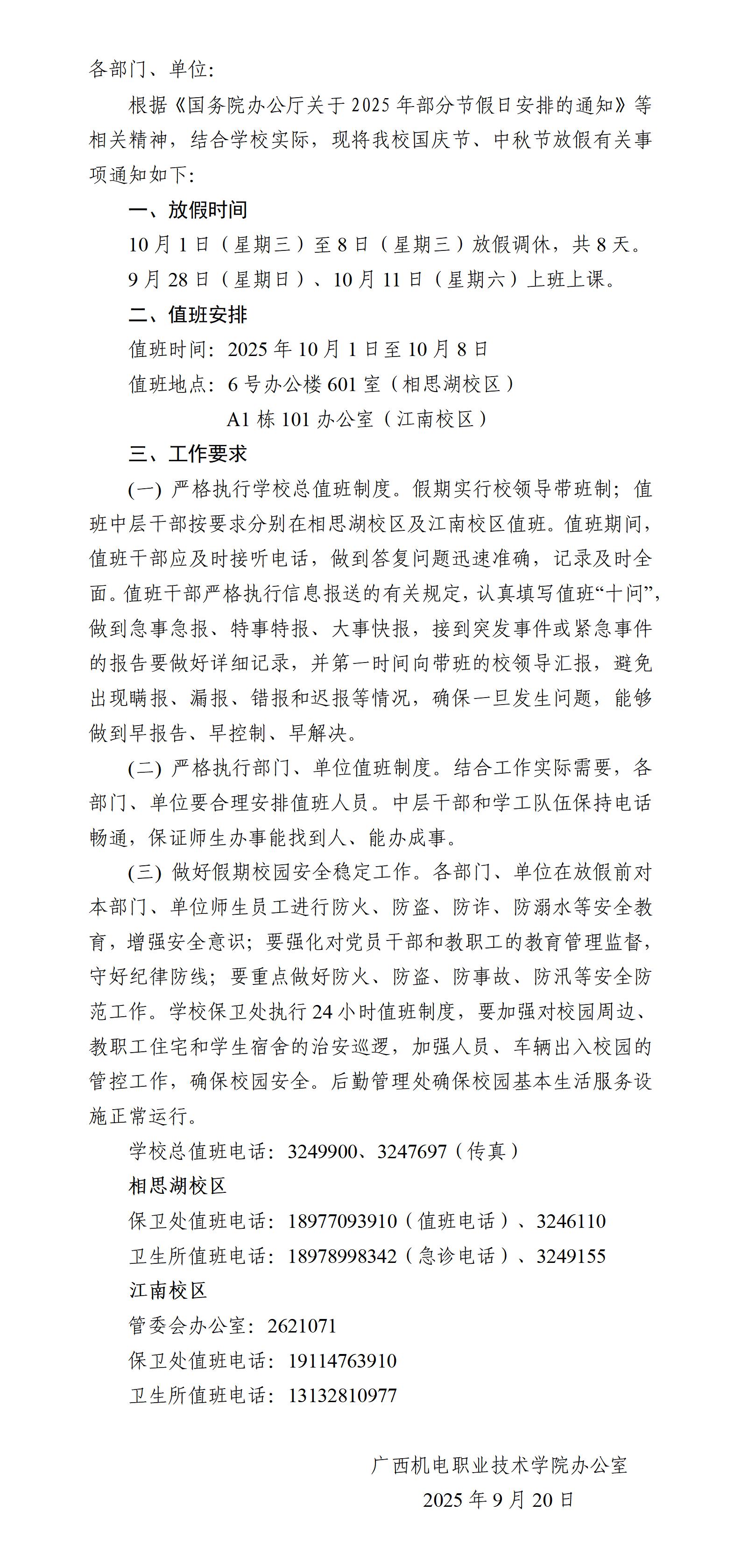 关于做好2025年国庆节、中秋节放假及值班的通知