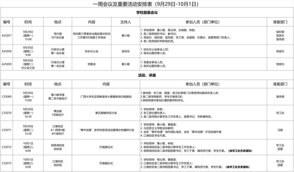 一周会议及重要活动安排表(9月29日-10月1日)