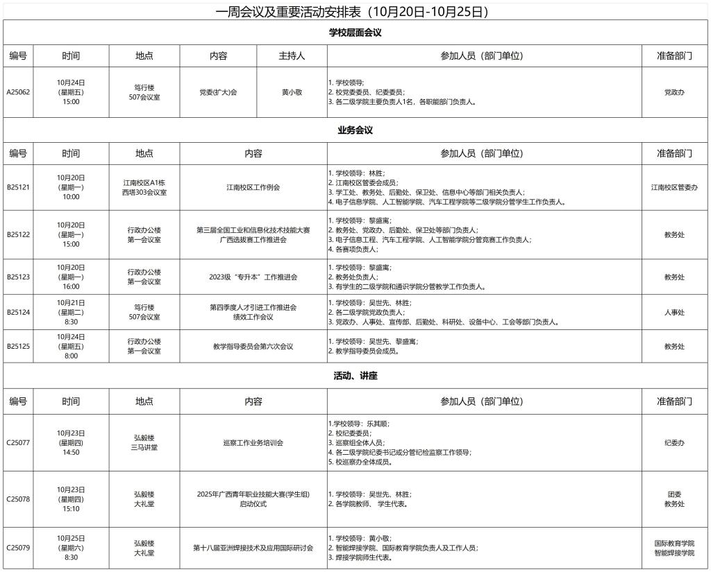 一周会议及重要活动安排表(10月20日-10月25日)