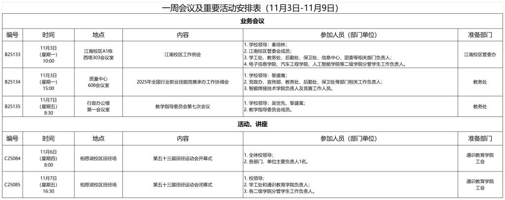 一周会议及重要活动安排表(11月3日-11月9日)