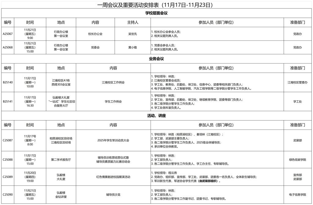 一周会议及重要活动安排表(11月17日-11月23日)