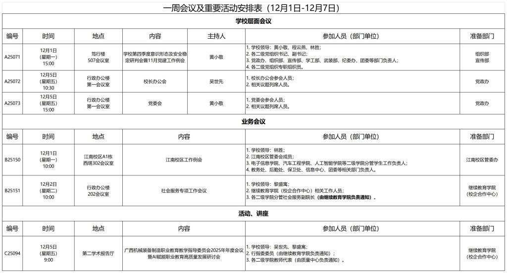 一周会议及重要活动安排表(12月1日-12月7日)