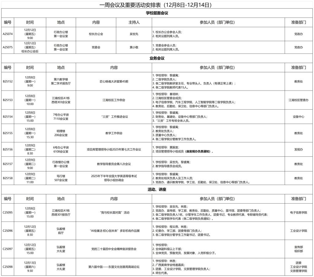 一周会议及重要活动安排表(12月8日-12月14日)