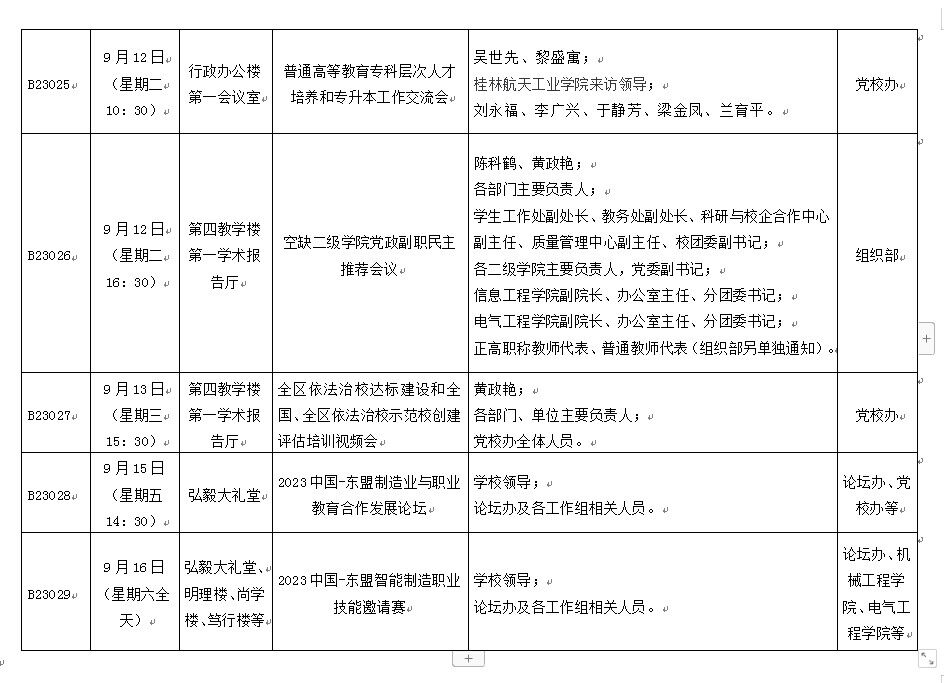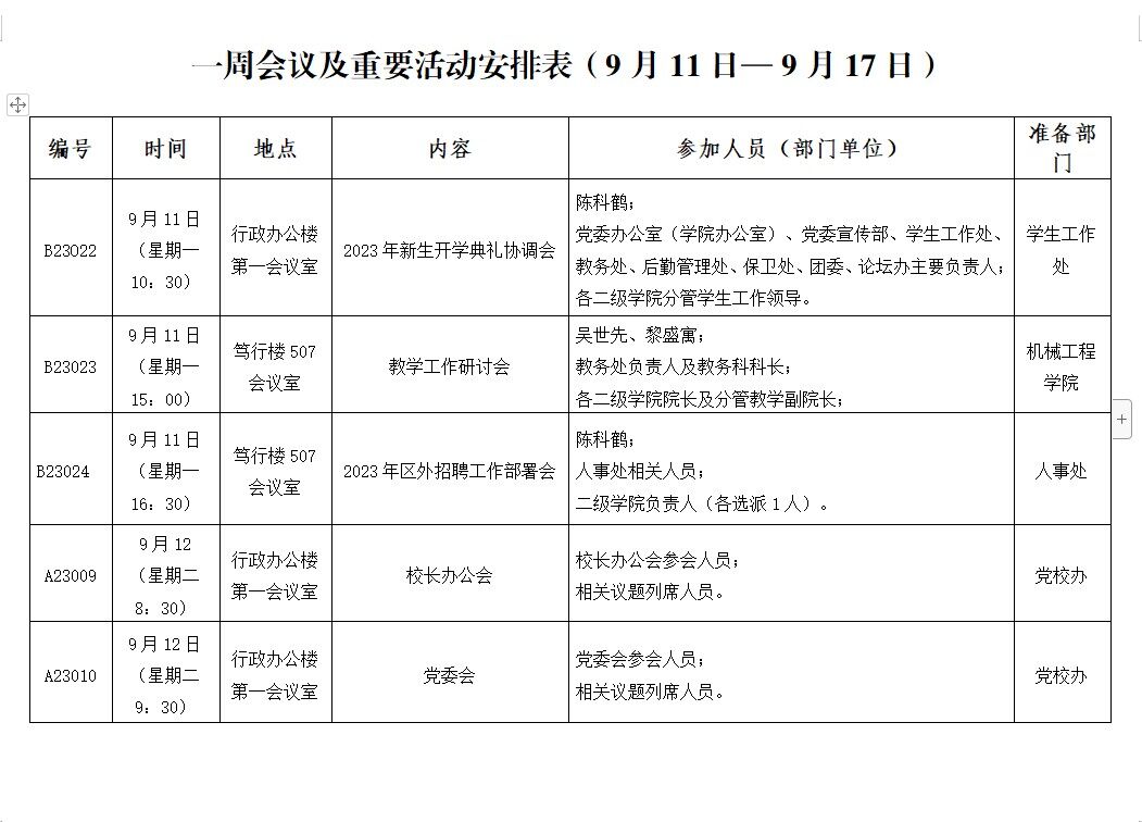 一周会议及重要活动安排表(9月11日— 9月17日)