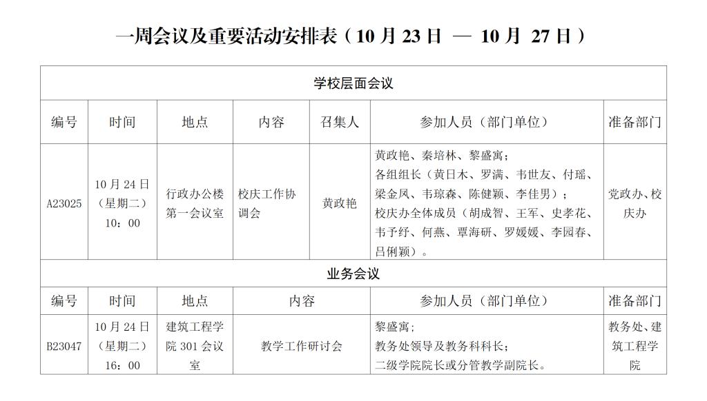 一周会议及重要活动安排表(10月23日 — 10月 27日)