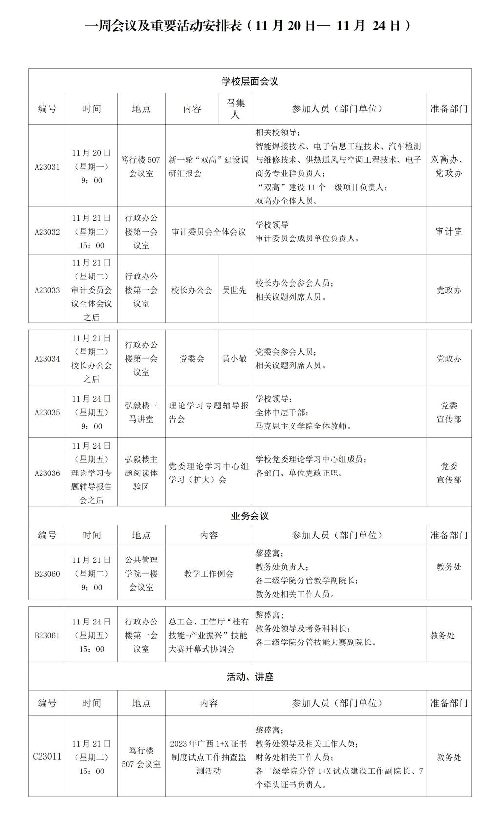 一周会议及重要活动安排表(11月20 日 — 11月 24日)