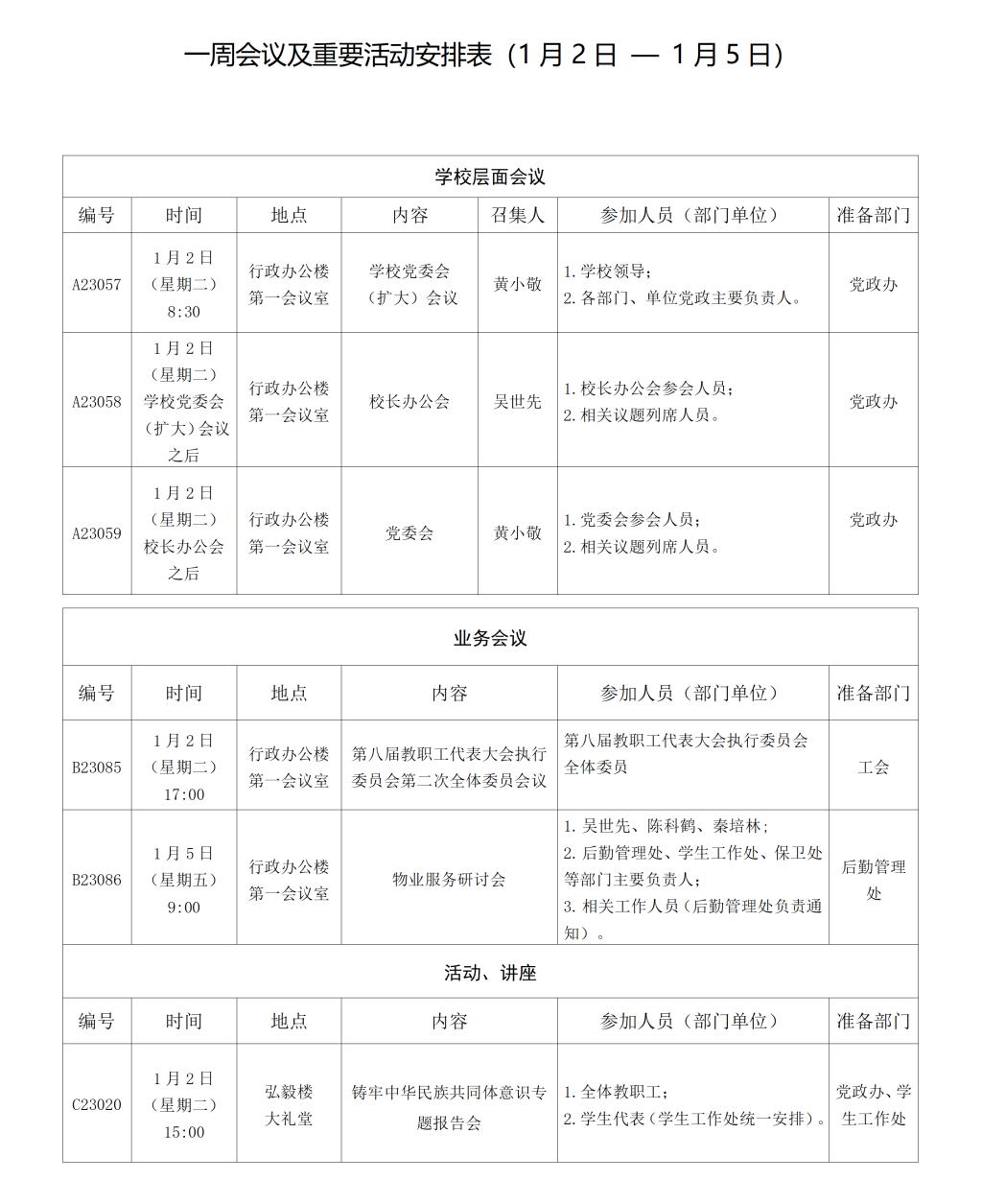 一周会议及重要活动安排表(1月2日 — 1月 5日)