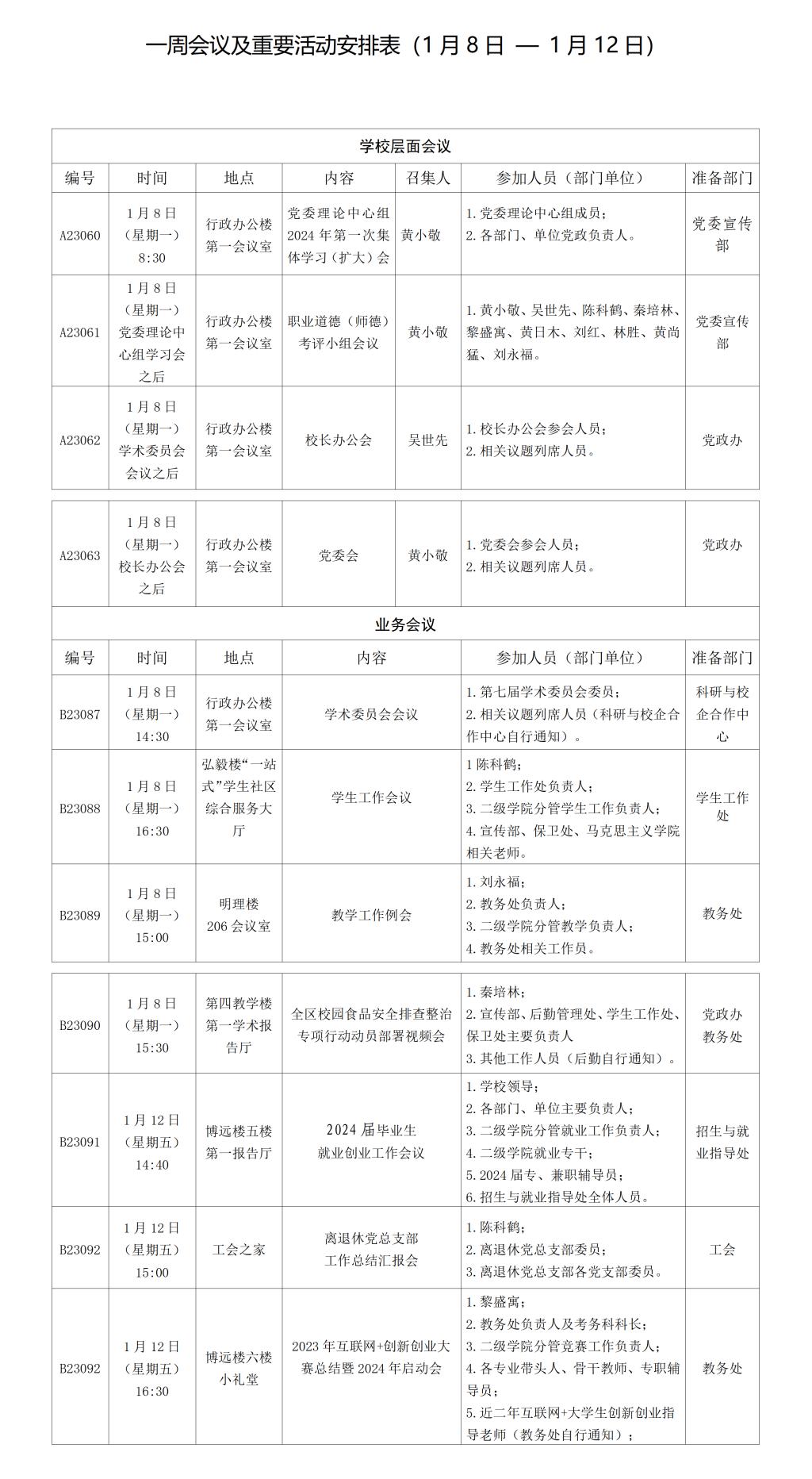 一周会议及重要活动安排表(1月8日 — 1月 12日)