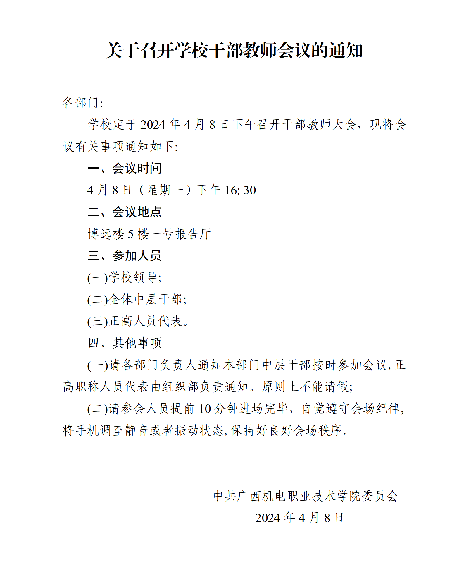 关于召开学校干部教师会议的通知