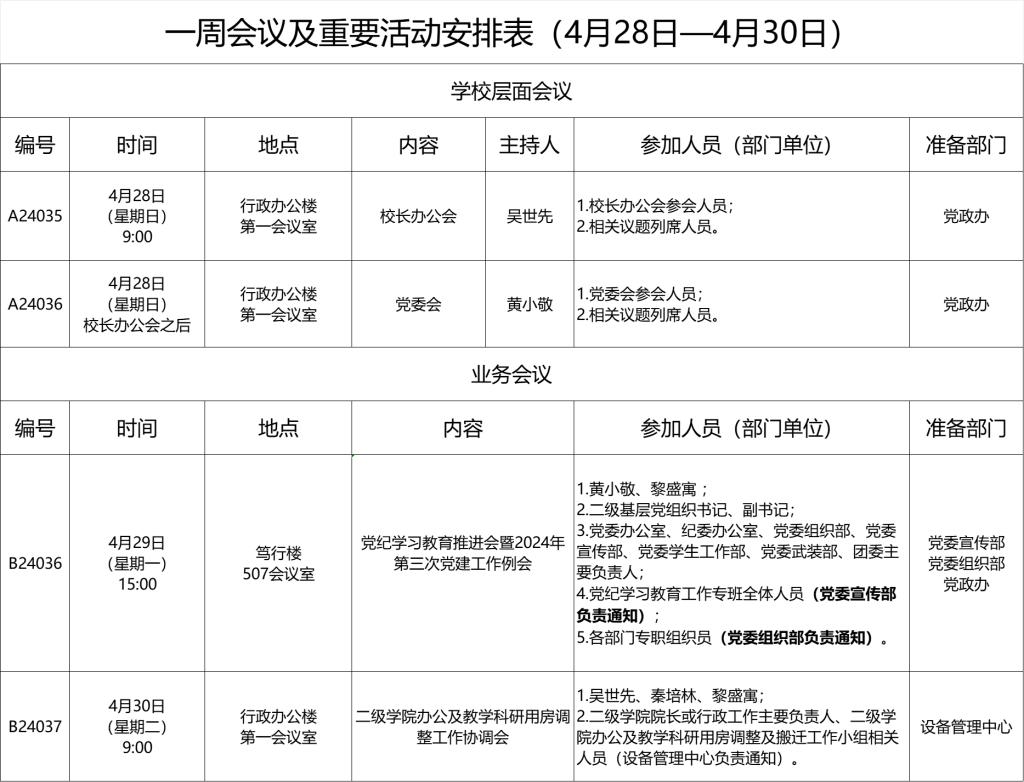 一周会议及重要活动安排表(4月28日—4月30日)
